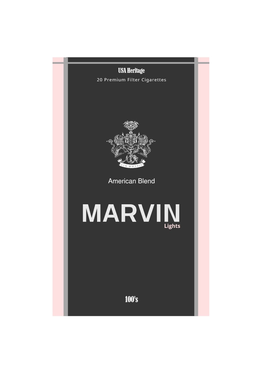 Marvin Lights with American Blend in 100’s packaging. A Premium Filter cigarette with U.S.A heritage, offering an authentic and lighter taste.